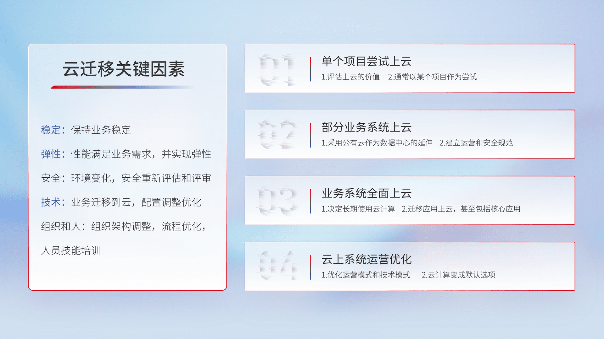 结合实际业务,,,从规划设计、、、、云平台选型、、、云原生改造、、、、数据迁移、、、集成交付,,,迁移全过程为客户识别最佳上云路径,,,,做好风险识别管理,,设计网络架构、、、身份权限、、安全审计合规、、操作审计、、日志审计、、、监控告警策略、、多站点容灾设计等,,对云上基础设施进行整体规划,,,,提升IT治理水平,,,,以满足弹性、、高可用、、高性能的需求。。